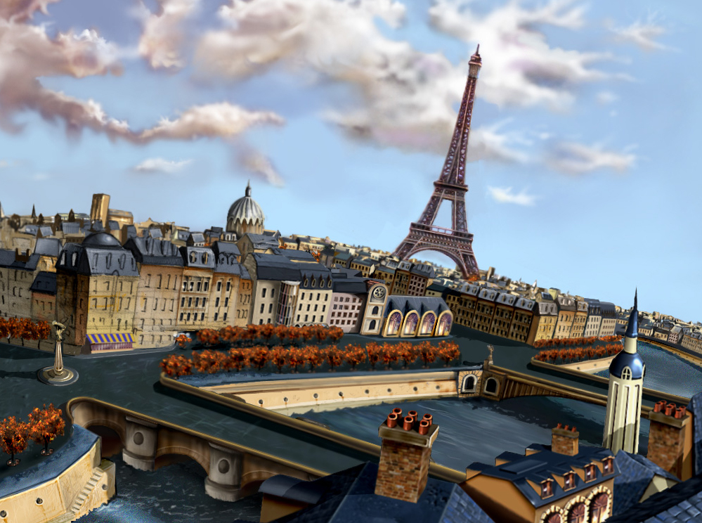 The pan move from stormy clouds over Notre Dame to blue skies over the Tour Eiffel is supposed to imply sinister overtones to an otherwise benign and content mood.