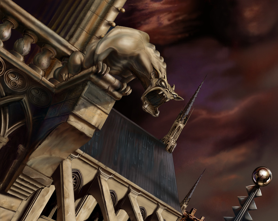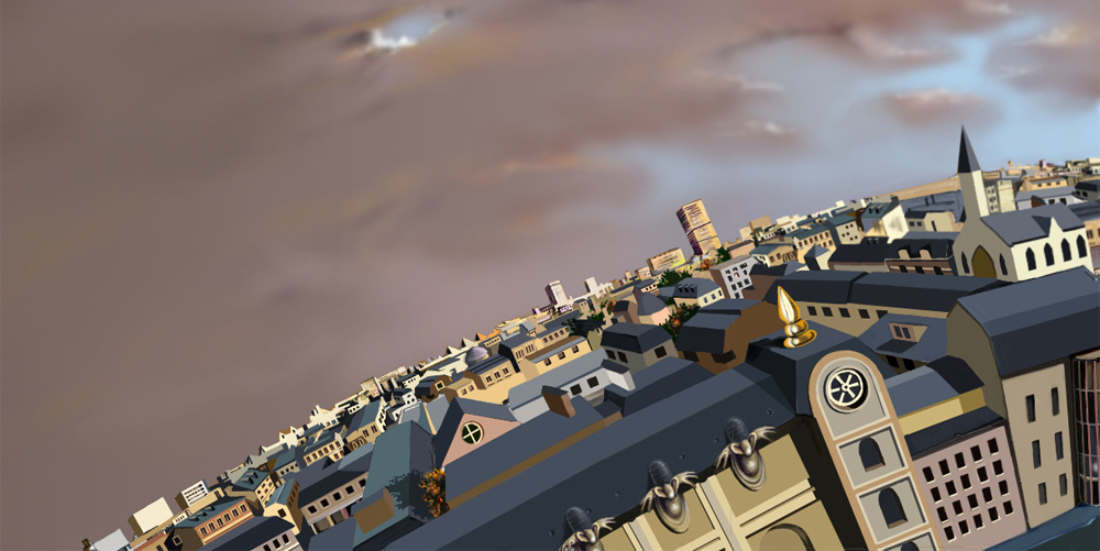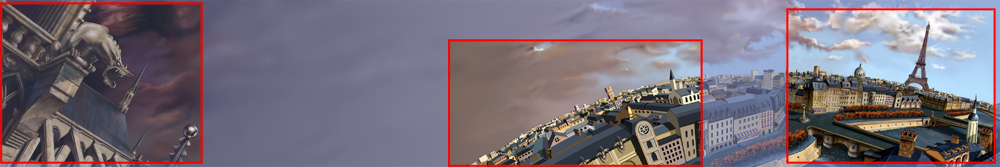 This image was painted for a pan move within the introduction sequence before the game starts. The move starts from a static position on the left, and comes to rest at the opposite end. As this game originally had to be compressed to fit on a cd rom, the level of detail is therefore proportional to the speed at which the picture is moving. There's therefore minimal detail in the middle where there's most movement and compression.