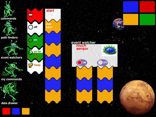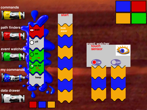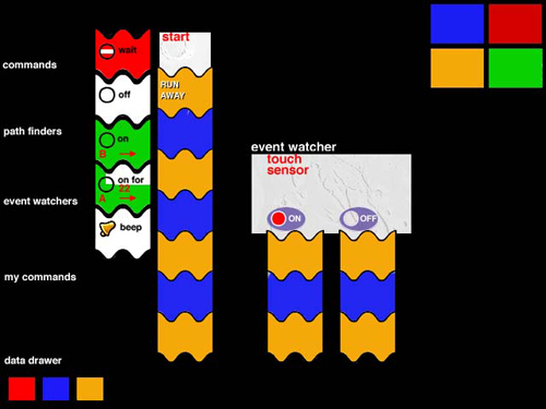 Shown here are a few of several experimental interface styles I was exploring during initial production work on the LEGO Mindstorms programming software.