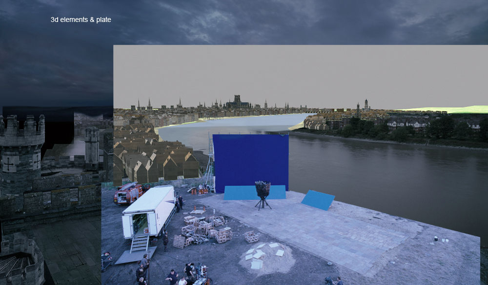 For this matte painting, I had a 3D hardware render of the city to work with and a small stage of live action around which everything else had to be added from scratch..