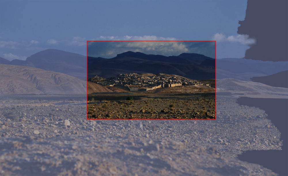 This is an insertion of the old city of Jerusalem, in front of which the characters on horseback are riding. Before painting in the city, the plate had to be cleaned up by removing the horses and then extended around all the edges.