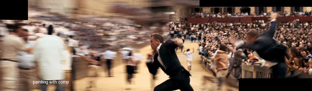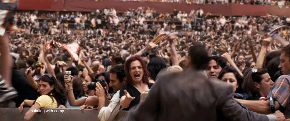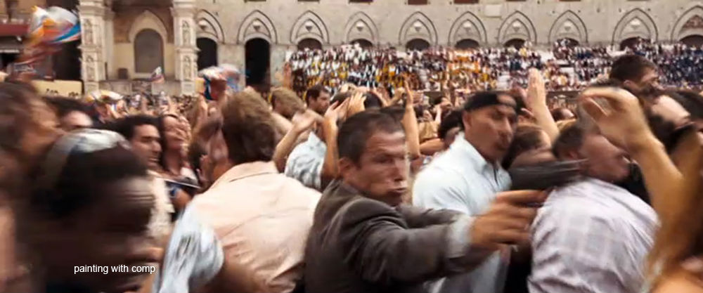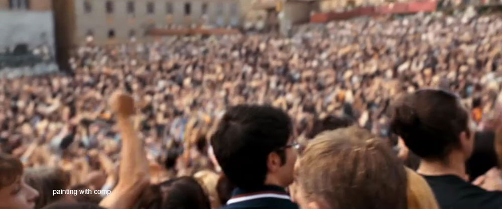 This scene was shot in the relatively empty Siena town square with a group of about 30 extras to make up the crowd close to the camera. This group was duplicated in comp from different shots in the mid-ground and the background crowd was made up from a combination of separate footage of the Palio di Siena horse race and matte painted stills. The examples here of of the few that were consisted totally of the stills. The hand held camera was shaking so much that these matte paintings could be tracked in without revealing too much of their static nature. Where necessary, moving elements such as flags and waving arms were superimposed to deceive the eye.