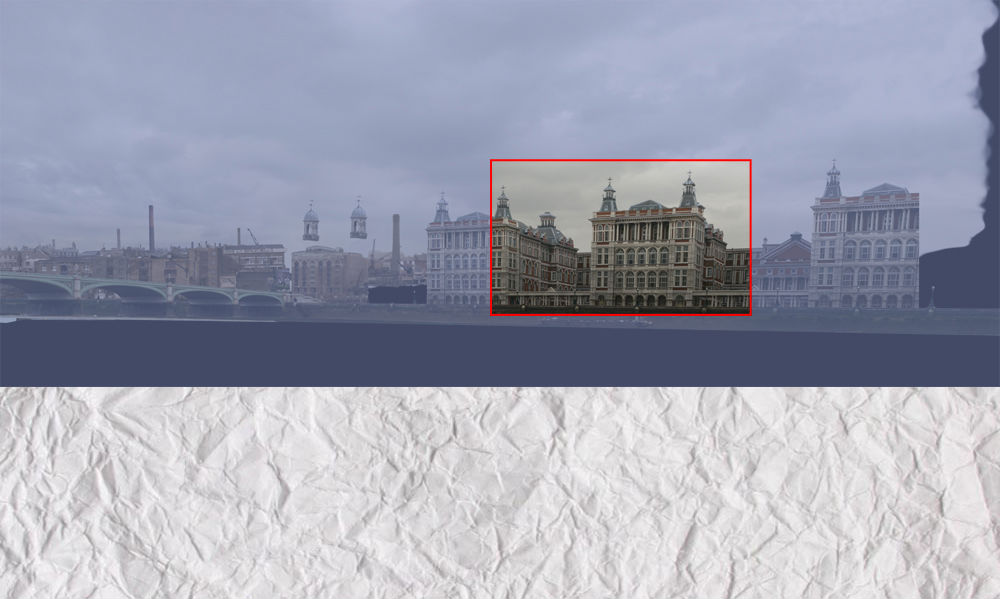 For this shot I had to research the physical ground plan of the old St Thomas' Hospital on the south bank of the Thames, as most of the hospital had been bombed during WW2. By extruding the ground plan upwards to match a couple of the still existing original facades, I then created a basic 3D model onto which I was able to project a painting (after getting help matching the lens information in Maya to the reference photographs) Special permission was needed for me to access the House of Lords' terrace at the Palace of Westminster in order to do so).
