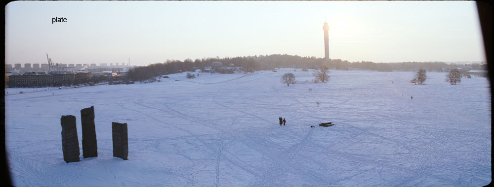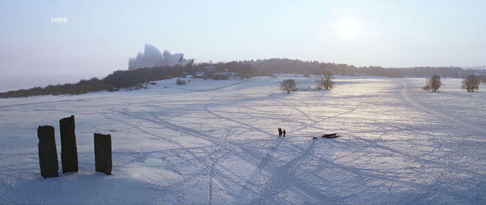 At the end of the film where the sun flares up, a wave of brightness sweeps across the image. The snow's albedo had to be painted in so a swipe-over could be made in comp (mouse over the bottom image).