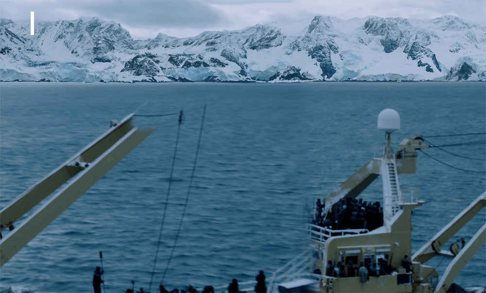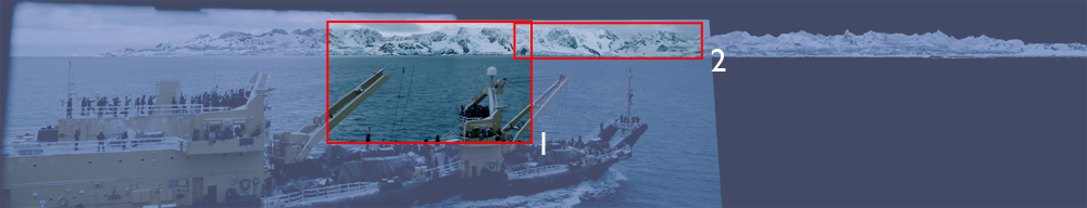 A large matte painting overscan to replace the background horizon and tracked into the comp. This was originally shot off eastern England and then made to look like the coast of Alaska. Click down on the roll-over to see an alternative dmp (minus clouds) with THE Paramount integrated into the image. Unfortunately this sequence was completely cut out of the film (do Google the issues this film had during production. It makes for long reading).