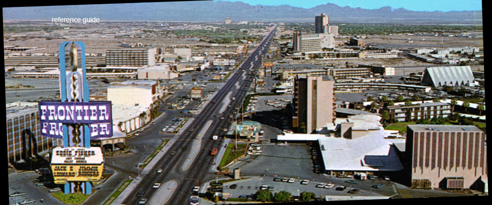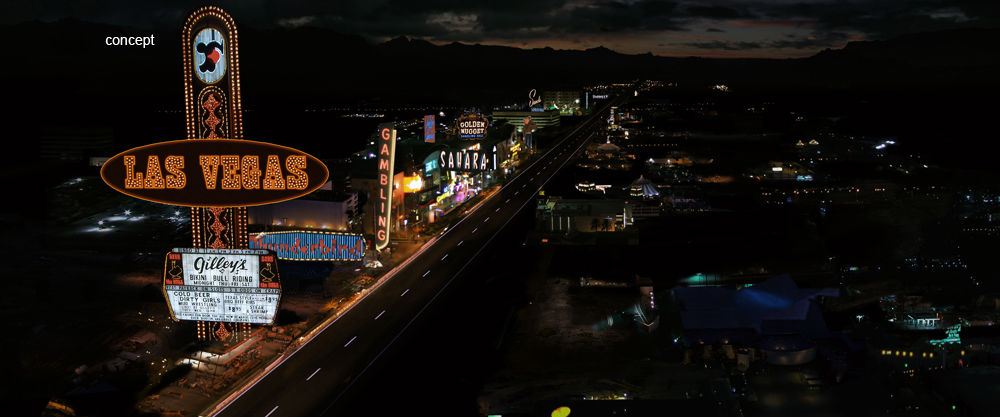 This started as a concept for a matte painting of an elevated view of a 1950's Las Vegas, dramatically less developed than today. It was to be based on a daytime photo seen in the top roll-over. However, the consistent thing between now and then is that all the names of the casinos remain the same, and each of them carry copyright issues when used in movie production. To have removed them was deemed impractical for the purpose of the storyline. The matte painting idea was dropped after several iterations to get around this issue.