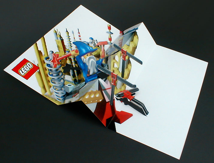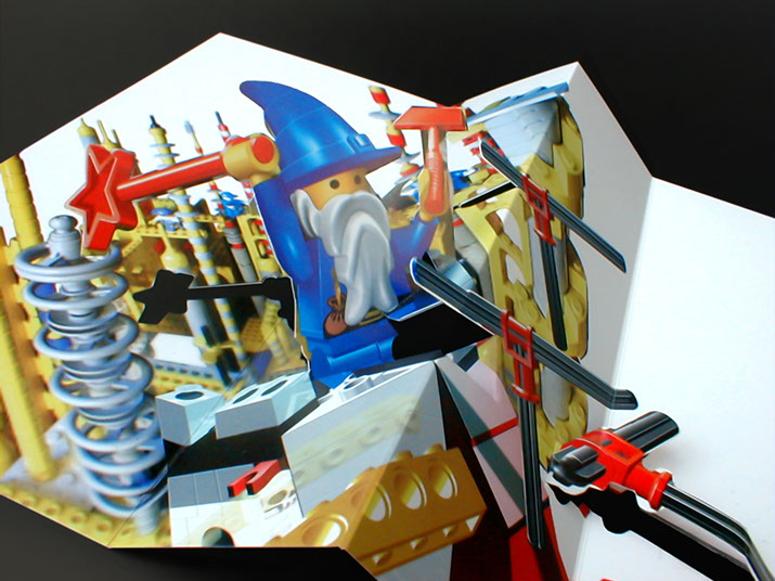 It was designed as an single A4 sheet with just a few simple machine cuts and folds with no glue. When folded back and forth, the wizard reveals a hammering action on the end of the protruding pole.